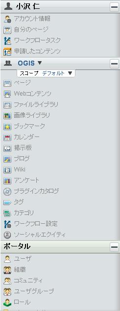 ![]() | ユーザ名:ポータルにログインしたユーザ名が表示されます。ユーザアカウント、個人ページ、申請したワークフロー処理、承認待ちタスクなどログインユーザ個人向けの設定や処理を行う機能一覧が表示されます。 コンテンツ:ポータルインスタンスのすべてのコンテンツを管理する機能一覧が表示されます。Webコンテンツ、ファイル/画像ライブラリ、ブックマーク、カレンダー、掲示板、Wikiなどが表示されます。コンテンツを管理するコミュニティ及び組織をドロップダウンリストから選択します。 ポータルインスタンス:ポータルインスタンスを管理する機能一覧が表示されます。ユーザ、組織、コミュニティ、ロールの追加と編集を行う機能もここに含まれます。ポータル全体の管理者の場合は、ドロップダウンリストから管理するポータルインスタンスを選択することができます。
