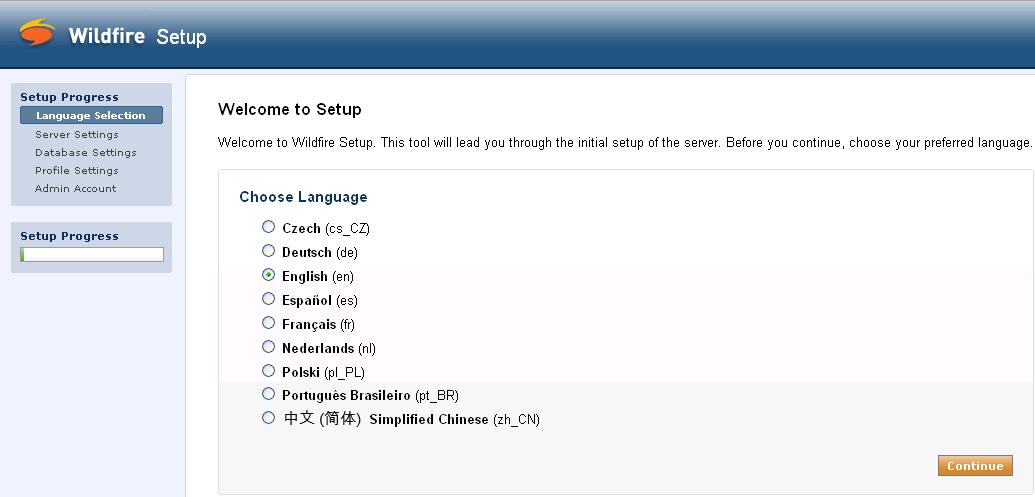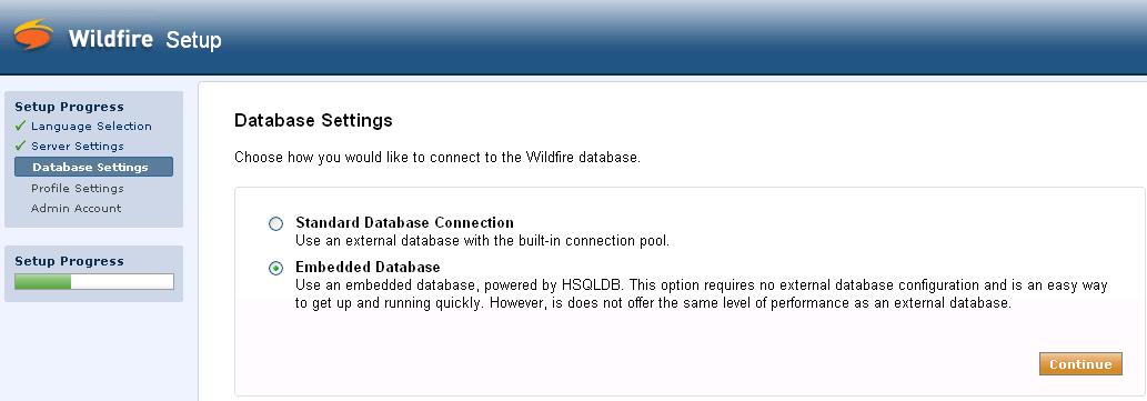 7. Choose your Database Settings. In our case I'm using mySQL, so I'll choose Embedded Database. Hit continue.