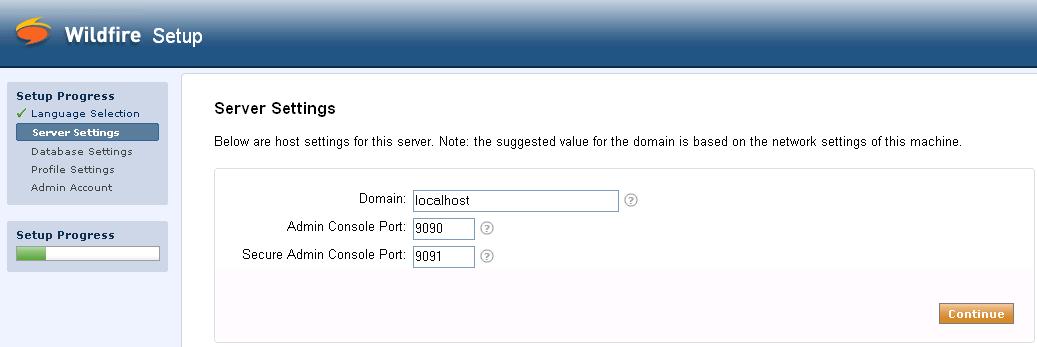 6. Enter your Domain. Wildfire will use the domain name to set your server name. In this case, I'm just setting up Chat for my localhost. Leave Ports as the default. Hit continue.