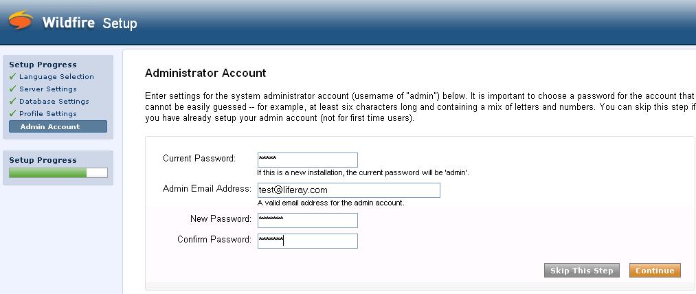 9. Setup your Admin Email Address and Passwords. Since this is a new installation, I need to enter "admin" into Current Password. Hit Continue.