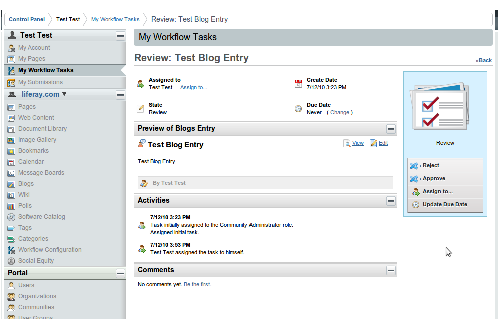 This wiki does not contain official documentation and is currently deprecated and read only. Please try reading the documentation on the Liferay Developer Network, the new site dedicated to Liferay documentation. DISCOVER Build your web site, collaborate with your colleagues, manage your content, and more. DEVELOP Build applications that run inside Liferay, extend the features provided out of the box with Liferay's APIs. DISTRIBUTE Let the world know about your app by publishing it in Liferay's marketplace. PARTICIPATE Become a part of Liferay's community, meet other Liferay users, and get involved in the open source project. My Workflow Tasks