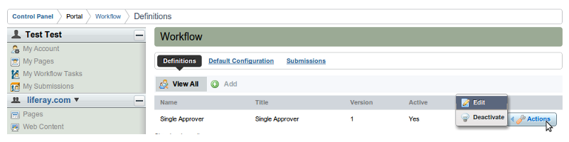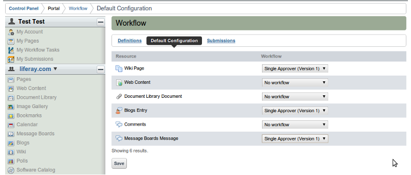 The Workflow portlet controls the workflow system for the whole portal. In this portlet you can manage all workflow definitions, configure the default behaviour for the portal and view all the portal's submissions