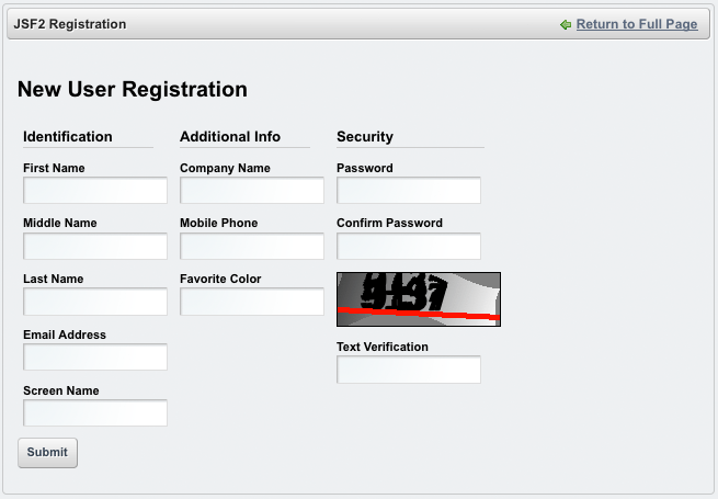 Contains a single portlet within the WAR that shows how to develop a JSF-based alternative to the out-of-the-box Liferay "Create Account" portlet. It uses Liferay Faces Alloy for UI form layout, and the <liferay-ui:captcha /> Facelet composite component from Liferay Faces Portal.