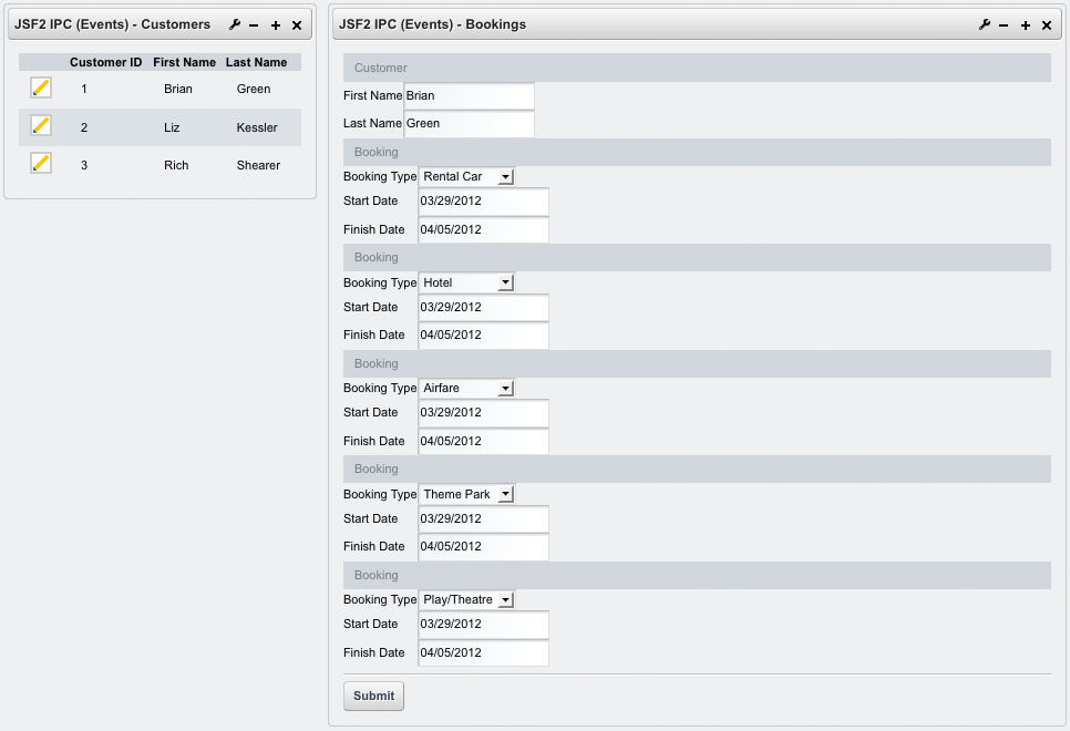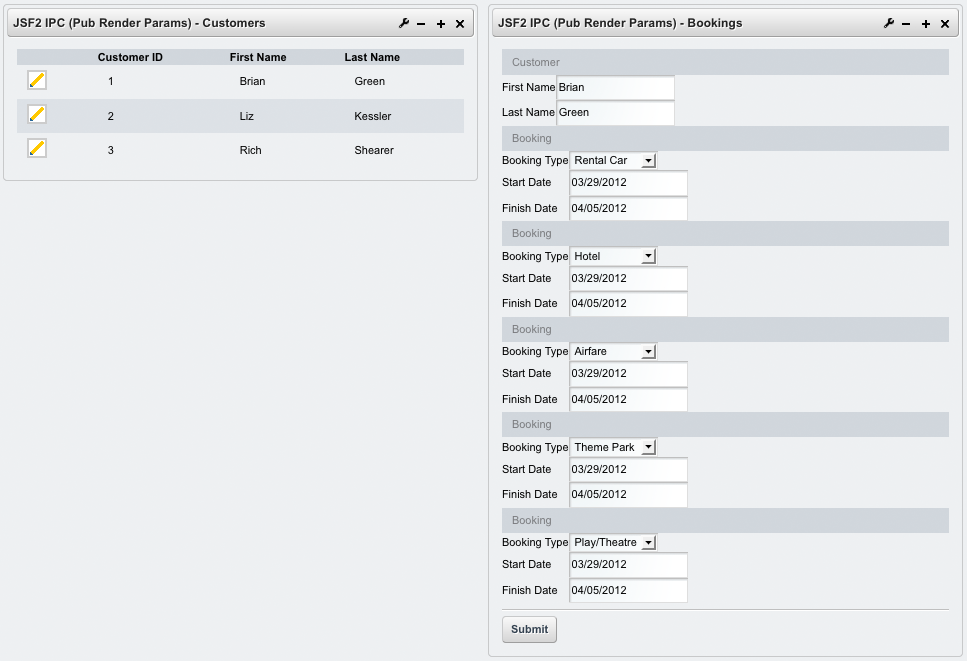 - When the customer's details (such as first name / last name) are edited in the Bookings portlet, the customer data is changed in shared memory and the Customers portlet will re-render accordingly.