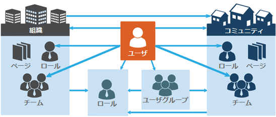 • ユーザ、グループ、組織は共通した関心ごとをもつコミュニティに所属することができる