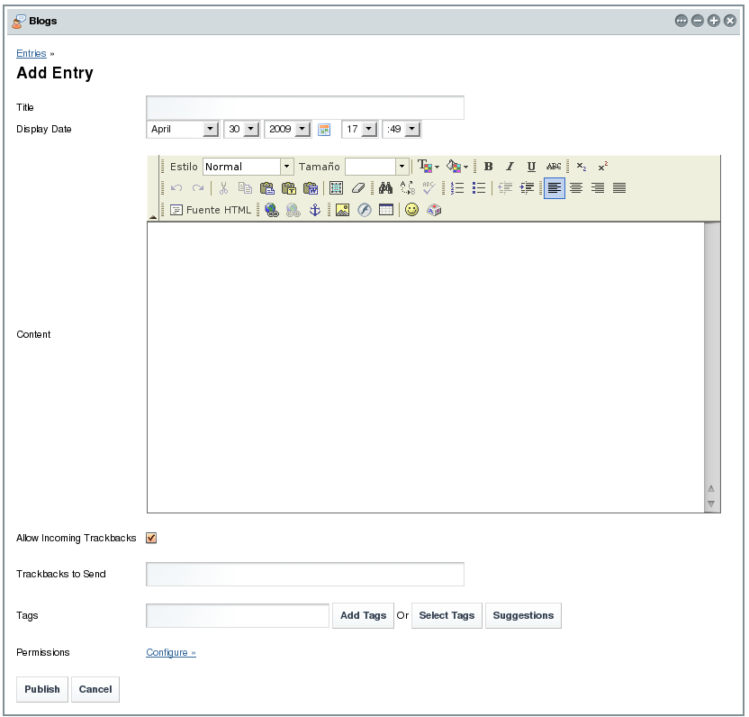This article describes the blogs portlet. This portlet allows you to run your own Blogs service. Every user can write his/her own entries. If the portlet is displayed in a personal page it will only show the user posts, but if it is displayed in a page of a community/organization it will show portlets from most of them.