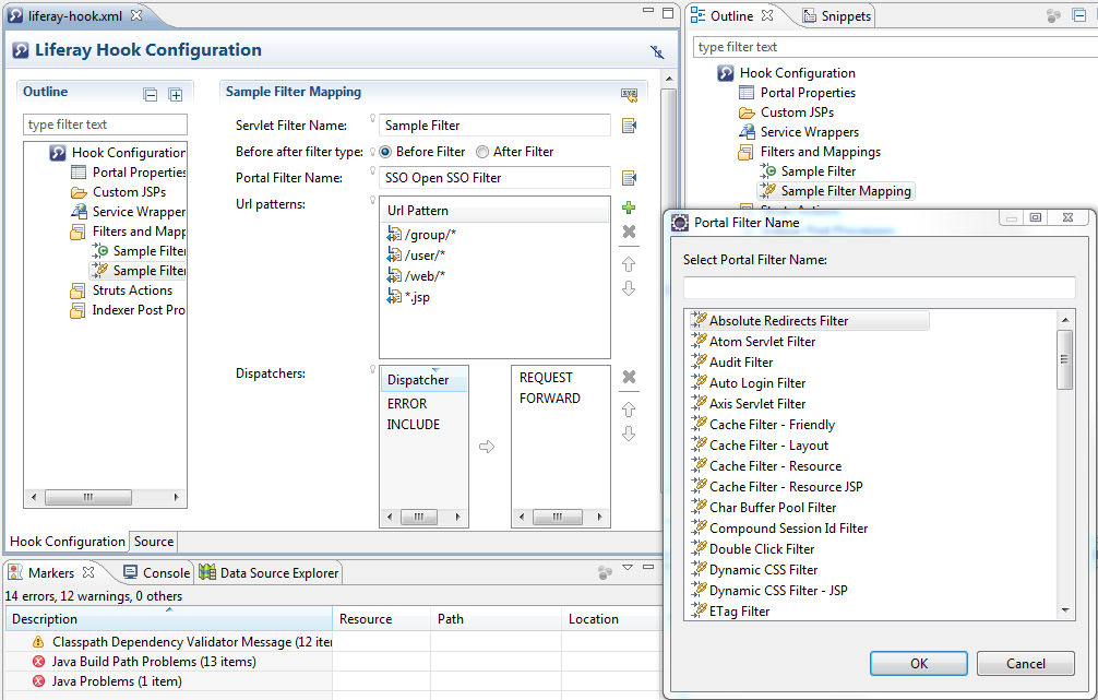 A new configuration editor for Liferay Hook has been added that adds advanced editing capability to liferay-hook.xml files. This complements the Liferay Hook Wizard that makes it easy to add new portal.properties or new custom jsps to your project after the initial hook wizard.