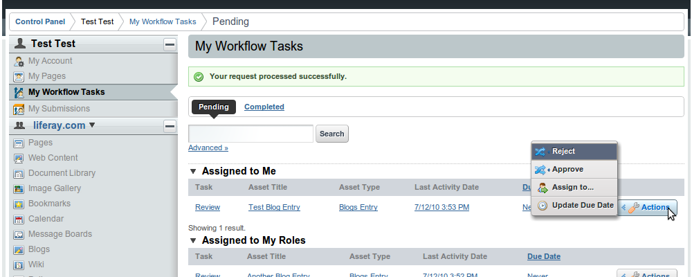 This portlet allows the users with the appropriate permissions to manage the workflow tasks. There are three possible views in this portlet: "pending", "approved" and "detail view"
