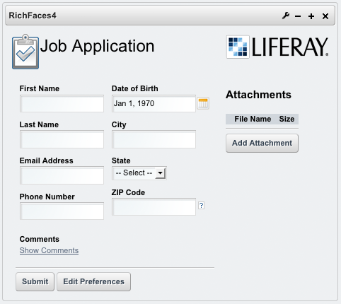 Contains a single "Job Application" portlet within the WAR that demonstrates several of the key features of JSF 2 and RichFaces: