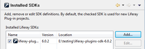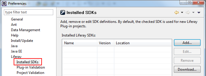 - 2. Open Preference page for Liferay > Installed SDKs ( Go to Window > Preferences > Liferay > Installed SDKs )