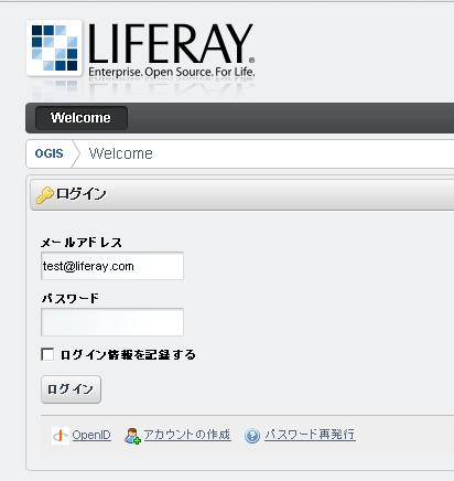 上記のユーザ名/パスワードを使ってポータルにログインしてください。Liferayのデフォルト設定ではメールアドレスをユーザ名として使用します。メールアドレスの代わりにあだ名を使用するように設定を変更することもできます。インターネットに一般公開する場合は、ユーザを特定できるメールアドレスを使用することをお勧めしますが、社内で利用する場合は社員番号を使用するようにもできます。