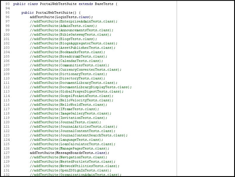 2. Comment out the tests you do not want to run from PortalWebTestSuite.java (Be sure you leave the login test in as it is necessary to log into the portal to use the message board portlet).