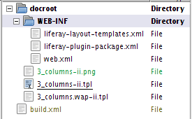 A layout template describes how various columns and rows are arranged to display the portlets. Layout templates are located in the deployed servlet's html/layouttpl/standard and html/layouttpl/custom directories as a series of .tpl files. The templates are defined in the source tree at /portal/portal-web/docroot/html/layouttpl/custom. They appear to be Velocity files.