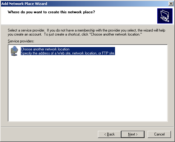 1. On Vista or Windows 7, right click on the Computer icon and select Add Network Location. On XP and Server 2003, open My Network Places in Windows Explorer and double click Add a Network Place.
