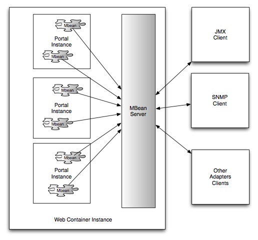 • Only one Mbean server instance. The default Mbean server is created and managed within the portal web application.