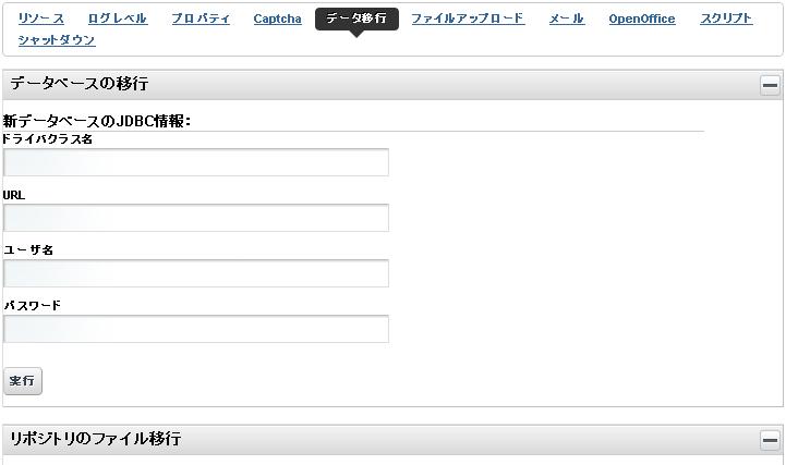 「リポジトリのファイル移行」と「リポジトリの画像移行」は、Liferayのファイルライブラリ及び画像ライブラリからファイルを複写するのに使います。送り先のフックを選択して「実行」ボタンを押下してください。実行する前に、portal.propertiesのフックの設定を行ってください。
