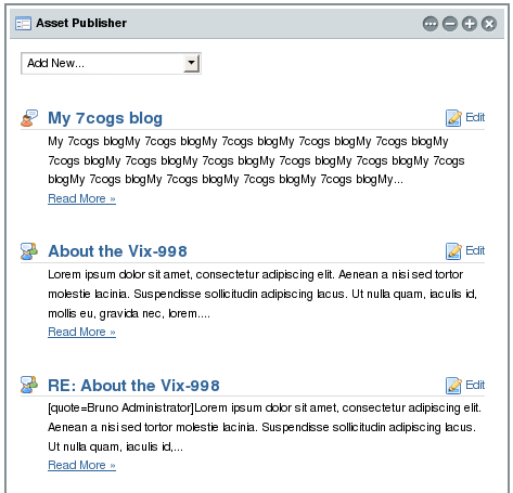 Asset Publisher also allows the end user to click an asset to see it in full detail, or even for some asset types (blogs, wiki pages, forums, ...) to be forwarded to the original context which originated the content.