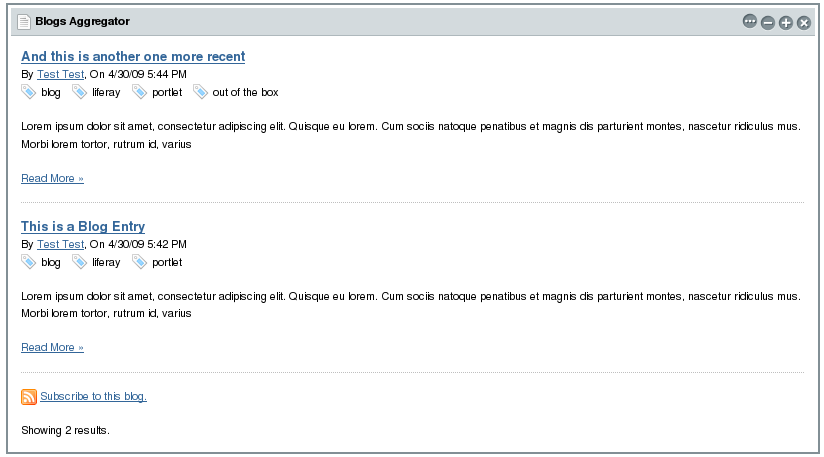 This page describes the blogs aggregator portlet. This is a portlet that grabs blog entries from the entire portal or by specific organizations.