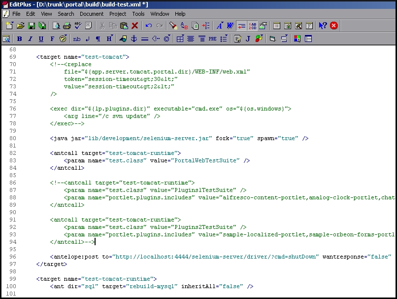 While previous methods for running the suite of Selenium tests remain valid, over time we have made some inroads in helping automate, improve, and quicken the process of testing. As developers we found that it rapidly became tedious to have to manually start selenium-server.jar, make sure that session expiration was set to a test compatible 2 minutes, start Tomcat, deploy the plugins under test, start the tests, rebuild the hypersonic database that has been populated with test data, and start again. This often resulted in a long turnover time in testing and also represented hurdles to running the tests in a continuous integration environment.