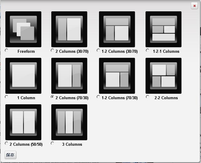 「処理」プルダウンを選択すると、「ページ」、「レイアウト」、「設定」、「コントロールパネル」が表示します。コントロールパネルはポータルの管理用のページです。詳細については「コントロールパネル」を参照してください。