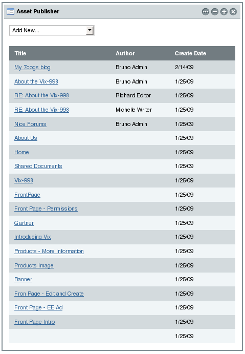Asset Publisher also allows the end user to click an asset to see it in full detail, or even for some asset types (blogs, wiki pages, forums, ...) to be forwarded to the original context which originated the content.