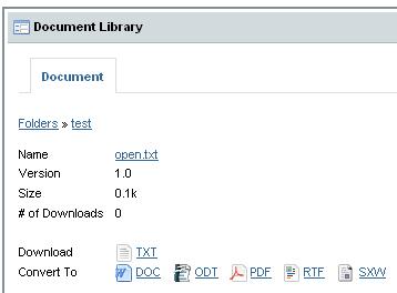 Liferay has built-in support for converting document types using OpenOffice.org backend.