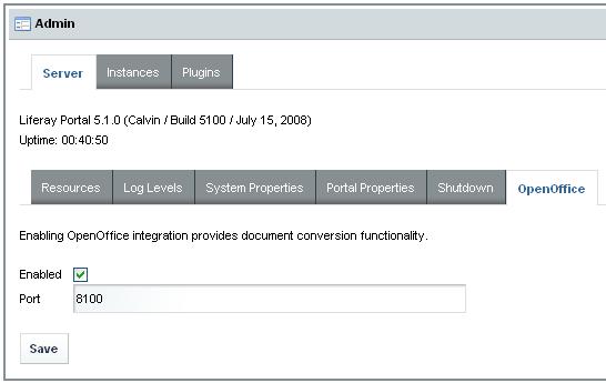 3. Go to Admin portlet, then click on the Server tab, then OpenOffice tab. Click on enable, in case OpenOffice is listening to a different port change the it accordingly.