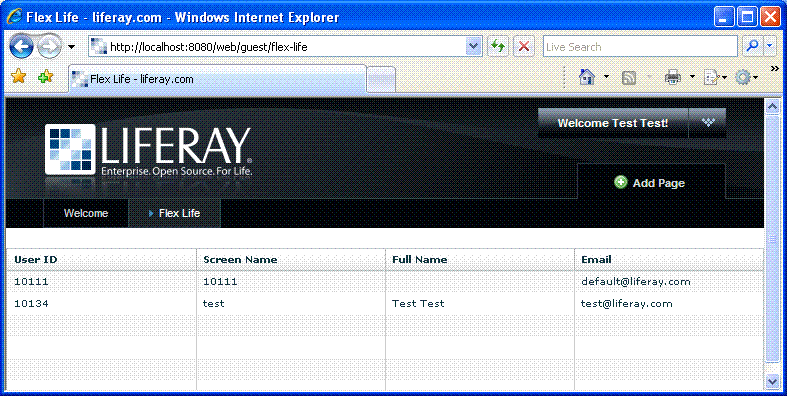 Log on to Liferay, add a page named Flex Life. Select Manage Pages, and set its type to be Embedded and URL to be /flexlife/flexlife.html. Go back to portal mode, and you will see this: