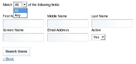 By default, the administrator is shown a simple search box to enter some text. That text will be used to search in all of the user's fields (first name, last name, screenname, etc.) and custom attributes.