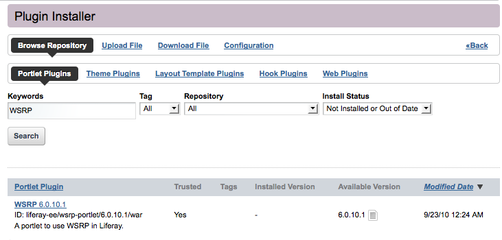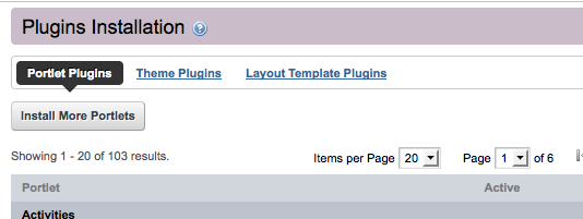 As you know, there are different ways of deploying a plugin in the portal, we are going to deploy the WSRP plugin through the UI, so go to the 'Control Panel' and 'Plugins Installation' and click on 'Install more portlet':