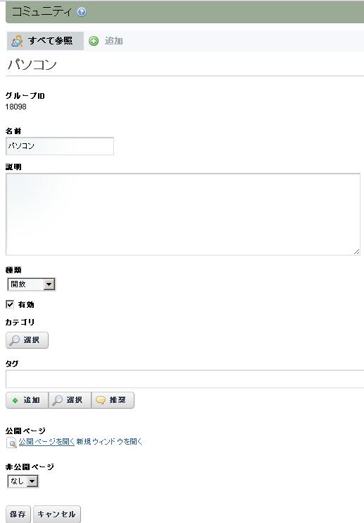 • 有効:コミュニティの活動は有効か無効か。無効な場合(チェックが外されている場合)は、コンテンツの追加、参照、変更を行うことができなくなります