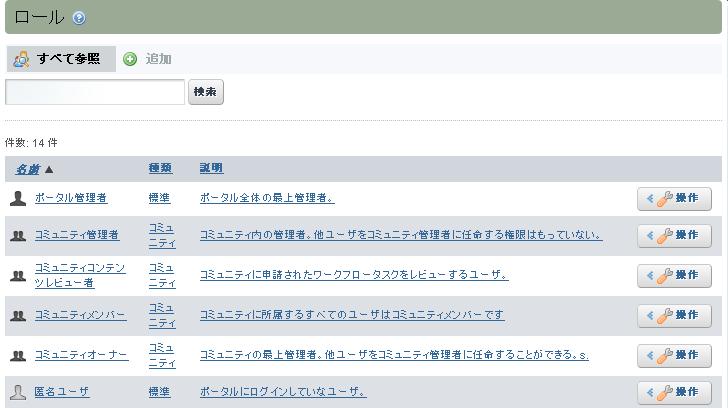 ポータル、組織、コミュニティのロールがあります。コントロールパネルの「ロール」からユーザにポータル、組織、コミュニティロールを割り当てたり、ロールに権限を割りつけることができます。