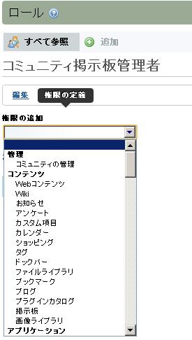 「権限の追加」ドロップダウンリストから、ポータル、コンテンツ、アプリケーション、コントロールパネルの権限をロールに付与することができます。ポータルロール以外のロールの権限の設定は、ポートレット毎に、ポートレットの右上の「編集」->「権限の設定」から行います。