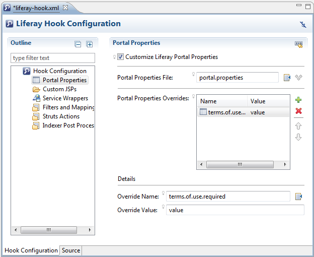 A new configuration editor for Liferay Hook has been added that adds advanced editing capability to liferay-hook.xml files. This complements the Liferay Hook Wizard that makes it easy to add new portal.properties or new custom jsps to your project after the initial hook wizard.