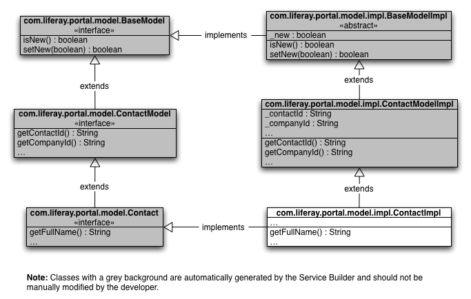 All the classes are generated by Service Builder and should not be modified, with the exception of ContactImpl. Let's look at what each of these classes does.