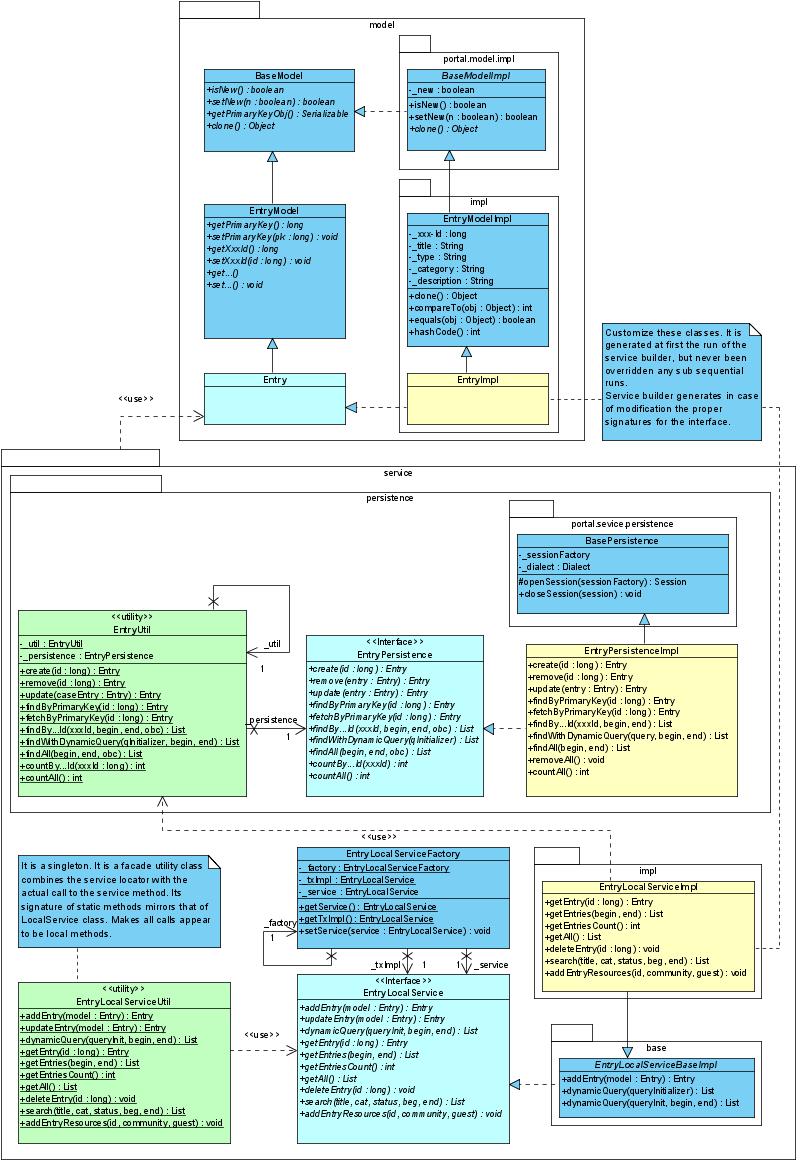 The Service Builder is a tool built by Liferay to automate the creation of interfaces and classes that are used by a given portal or portlet. This includes code for EJBs, Spring, Persistence, and Model.