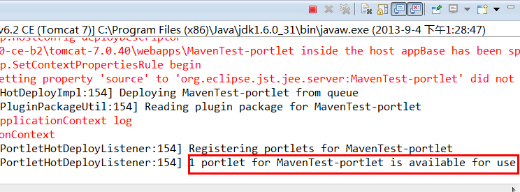 - Then you will see 'MavenTest-portlet is available for use'in the Console