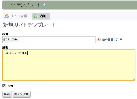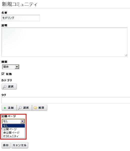 定義された添付ーとを利用したコミュニティを作成するには、コントロールパネルから「コミュニティ」を選択します。「追加」を選択して、新しいコミュニティを作成します。「公開ページ」からドロップダウンリストを開きます。有効になっているサイトテンプレート一覧が表示されます。基にするテンプレートを選択します(例:ITコミュニティ)。「保存」ボタンを押下してコミュニティを保存すると、そのコミュニティにテンプレートのページが追加されます。