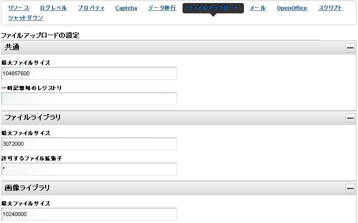 ファイルライブラリや画像ライブラリのようなところにアップロードできるファイルの種類や大きさに制限を掛けることができます。デフォルトのファイル制限を設定して、各機能毎にその制限を上書きすることができます。