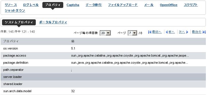 Liferay及びJVMには多くのプロパティが設定できます。プロパティページはそれらのプロパティと有効とされているプロパティの値を表示します。このページからは、プロパティとその値を表示するだけで、プロパティの追加や値の変更は行えません。