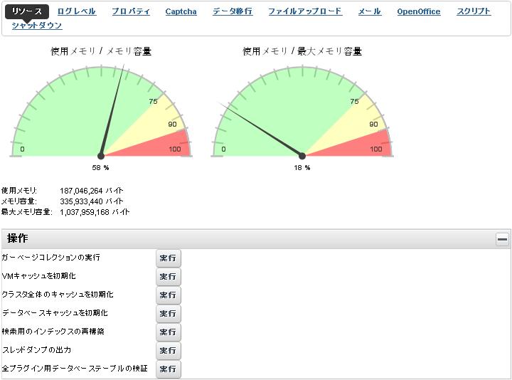 リソースページからは、ポータルサーバのメモリ利用量の表示や各キャッシュの初期化及びインテックスの再構築などを行えます。