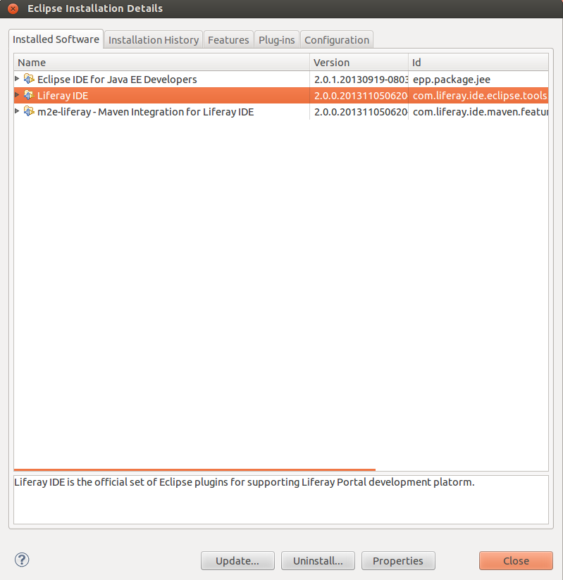 - Browser http://releases.liferay.com/tools/ide, click any 2.0.x version you want, access that updatesite page and copy the url to the software manager. If you want the latest milestone release, please access http://releases.liferay.com/tools/ide/latest/milestone/