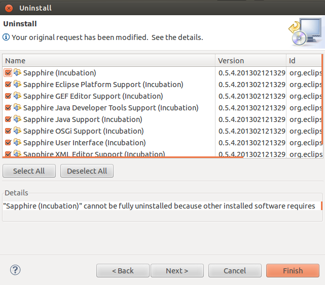 Check your root categories, and uninstall all the sapphire, m2e, wtp, m2e-wtp and ivy features if they can be found on the root categories. - In our IDE 1.6.2 - 2.0.0 M2 example, select all the sapphire features on the root categories and click Uninstall...