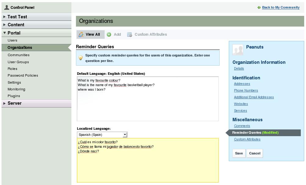 users.reminder.queries.questions=what-is-your-primary-frequent-flyer-number, what-is-your-library-card-number,what-was-your-first-phone-number,what-was-your-first-teachers-name, what-is-your-fathers-middle-name }}} This property allows us to write the pre-set reminder queries. (By default, they are the same used by Google). It is important to separate them by commas, no capital letters and hyphens between words. Writing them in this format allows Liferay to show them in different languages to users.