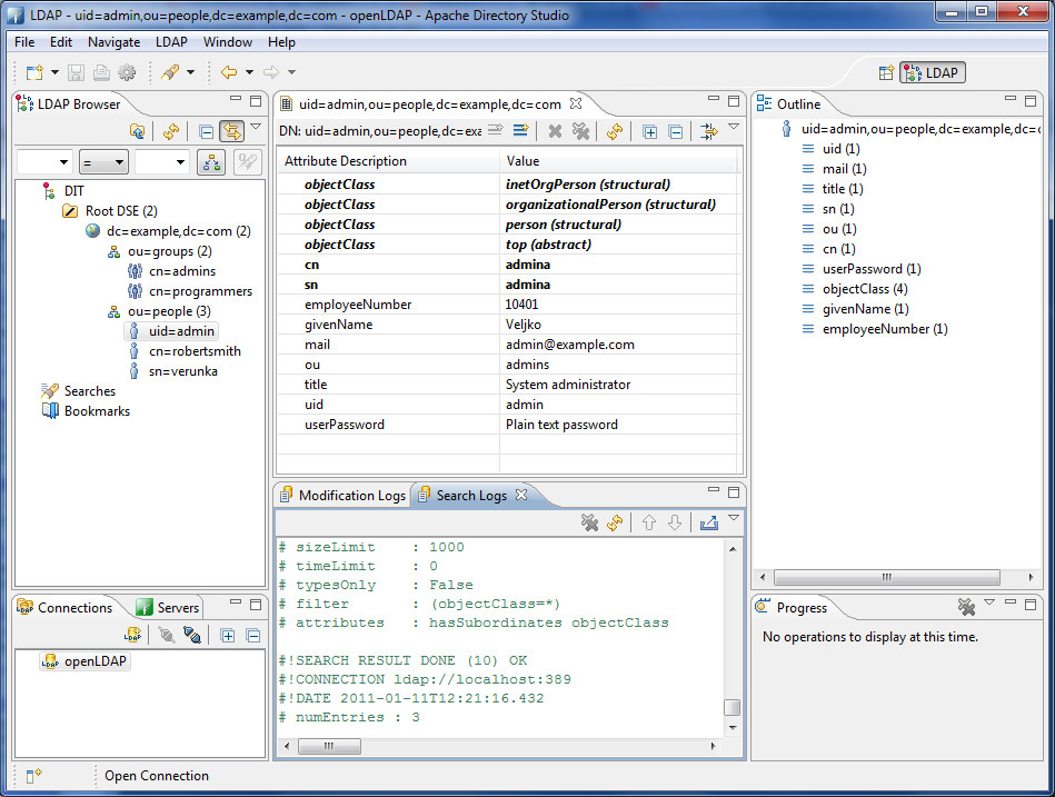 Connection Base Provider URL: ldap://localhost:389 Base DN: dc=example,dc=com Principal: cn=root,dc=example,dc=com Credentials: secret