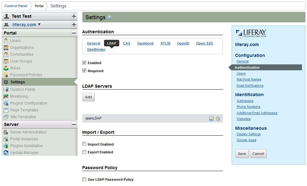 Although the settings can be defined in portal-ext.properties, we will use Control Panel to add OpenLDAP server, since portal offers nice feature, to check if entered parameters are correct. Note that web-based settings override settings from properties file. LDAP servers can be added in the "Control Panel > Portal > Settings" section: