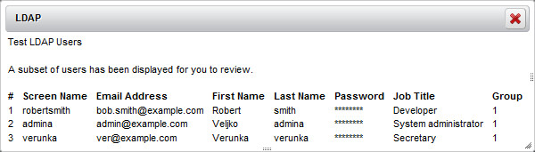 'Test LDAP Users' will test parameters by reading users from the LDAP server. If everything is ok, the result may look like this: