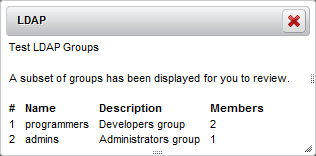 Similarly, 'Test LDAP Groups' will test parameters by importing user groups. If everything is ok, the result may look like this:
