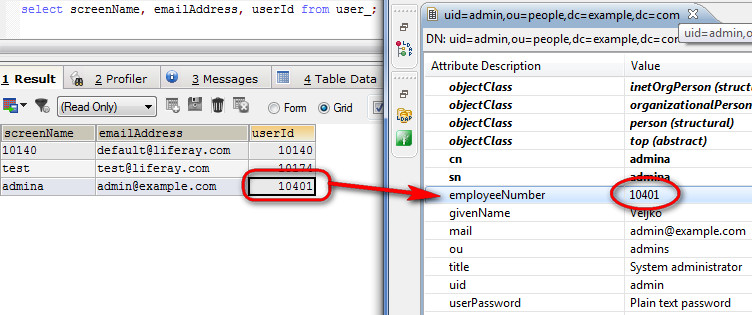 At this point everything is prepared: OpenLDAP server is up, portal is connected to LDAP server and Tomcat is ready to use the same LDAP server for authentication. However, we are still missing one key point. As defined in the jaas.config, we are using employeeNumber to identify an user in the LDAP server. This number is actually the userId sent by portal to Tomcat. Problem is that at this moment LDAP users doesn't exist in portals database, so there is no userId defined.
