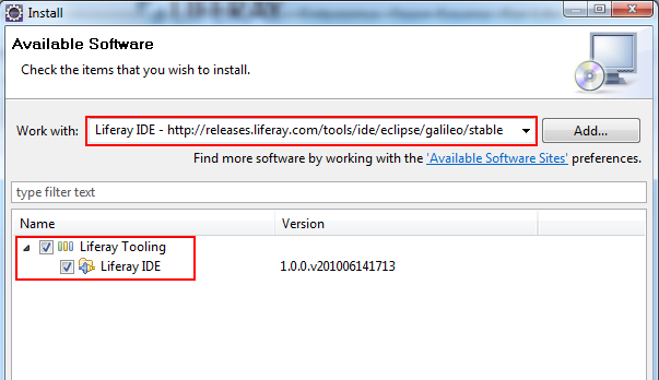 - 8. When the table refreshes you should see Liferay Tooling category and one entry for Liferay IDE feature, select the checkbox to install the feature.